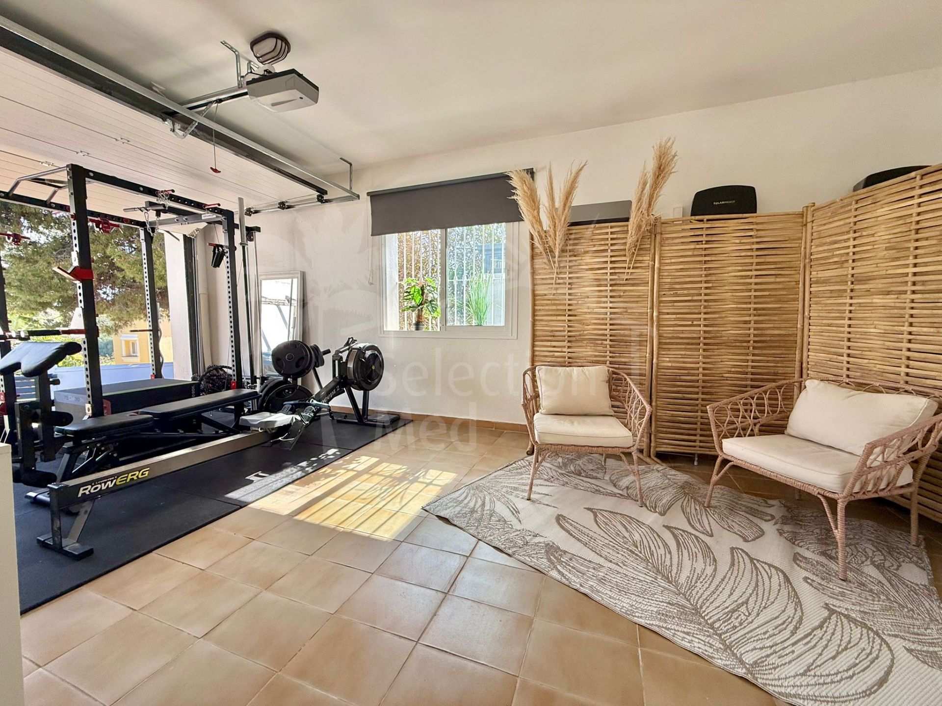 Confort et durabilité sont parfaitement intégrés, avec des caractéristiques telles que la climatisation, une salle de sport privée et des panneaux solaires. Les espaces de vie intérieurs et extérieurs se mélangent sans effort, offrant un accès direct à une terrasse privée, un jardin magnifiquement paysagé et une piscine généreuse – parfait pour la détente et le divertissement.