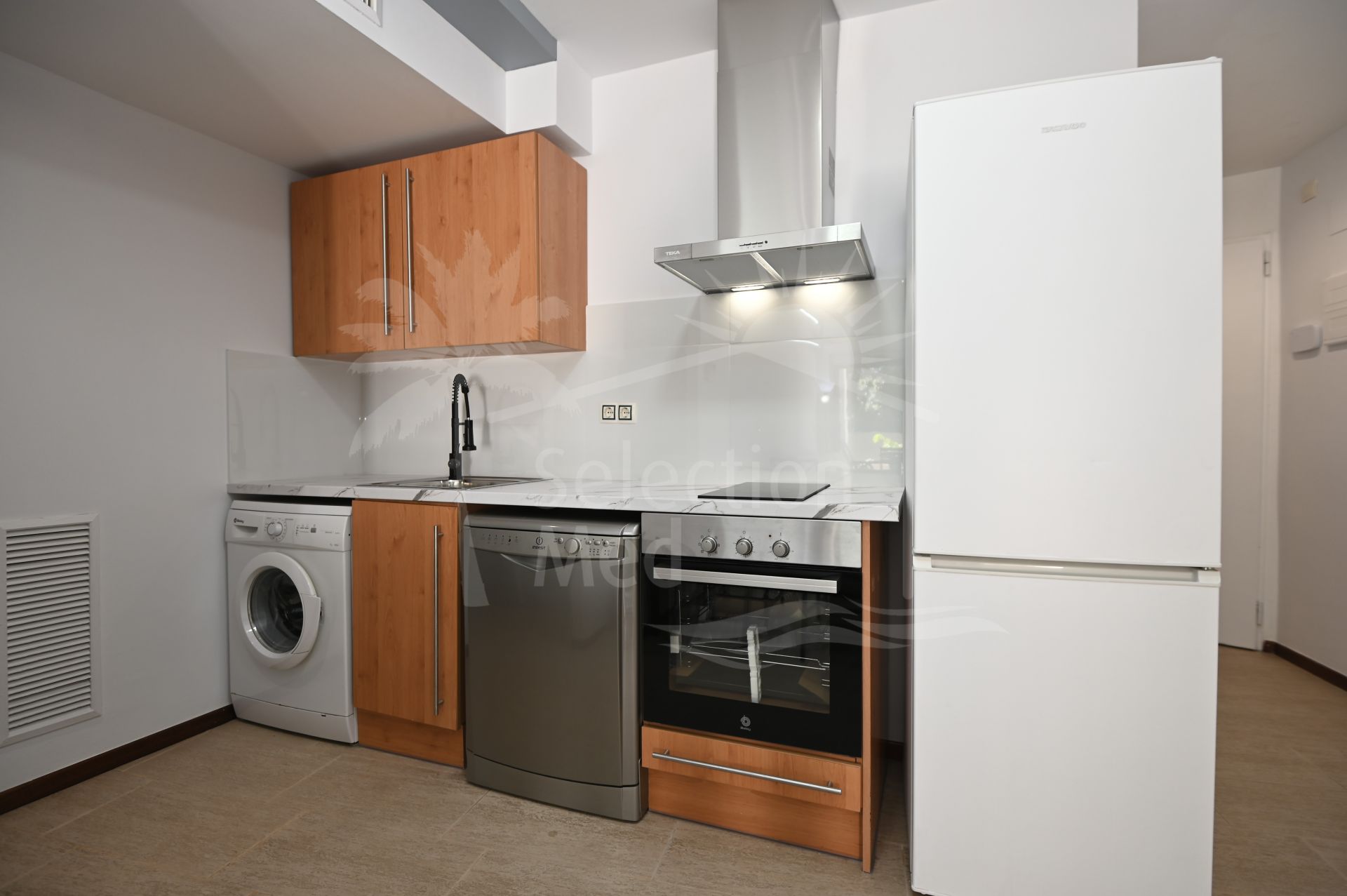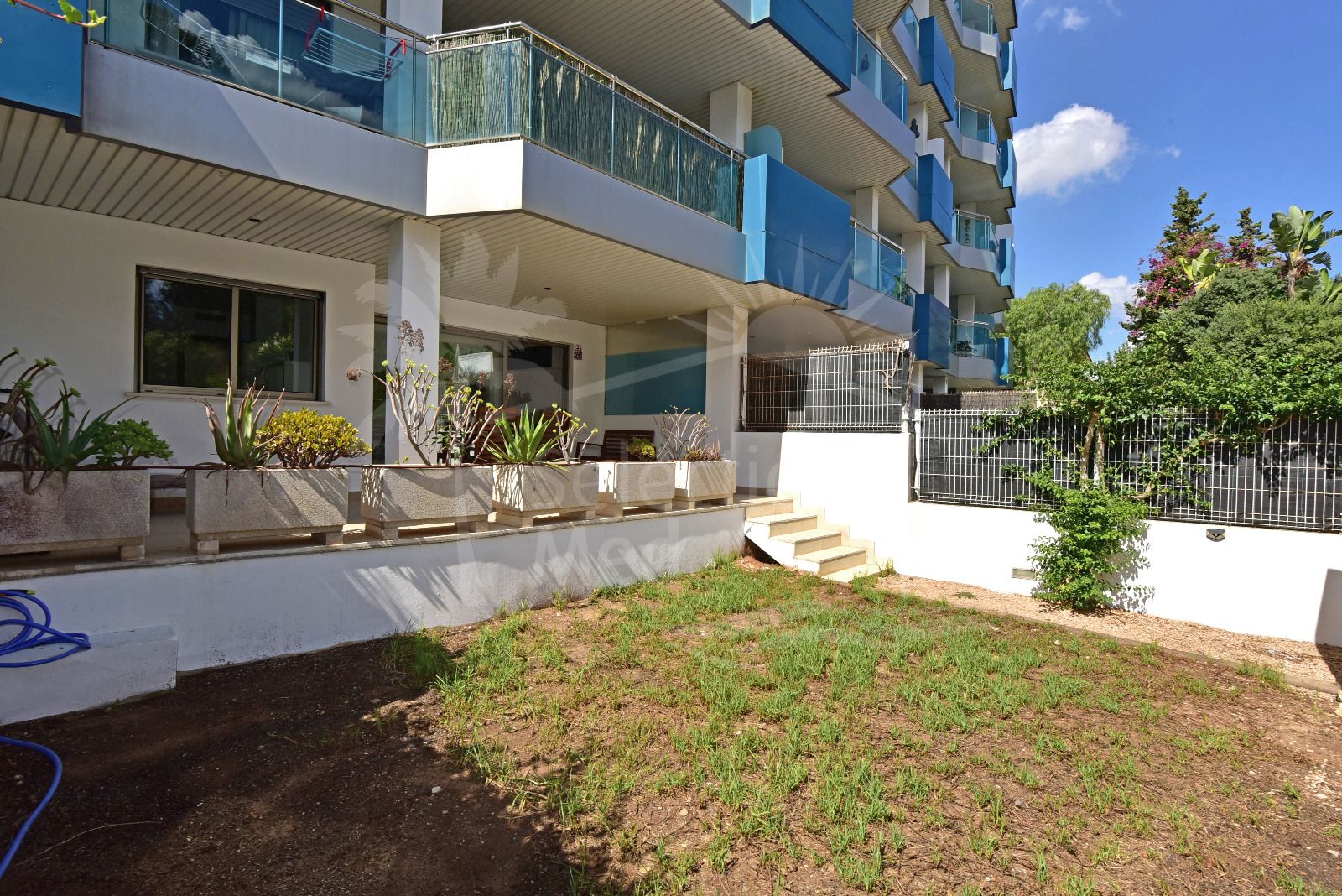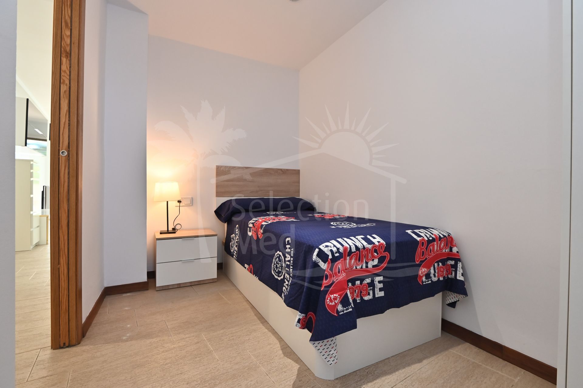L’appartement, récemment rénové et en excellent état, est situé au rez-de-chaussée et se distingue par son design fonctionnel et moderne. Il dispose de deux chambres, une double et une simple, d’une salle de bain complète et d’une cuisine ouverte parfaitement intégrée à l’espace principal. Le logement offre une surface construite de 96 m², dont 79 m² habitables, complétés par une terrasse privée de 22 m² et un jardin de 38 m² avec accès indépendant, idéal pour profiter de la vie en plein air en toute intimité.