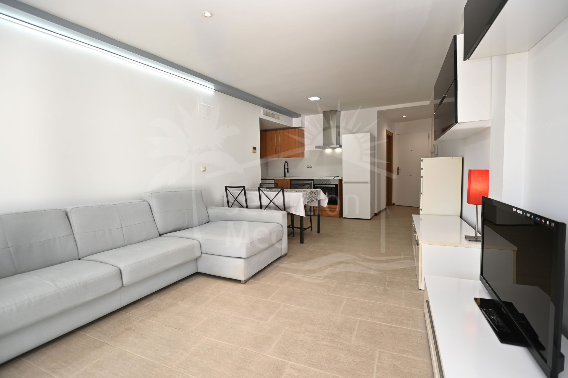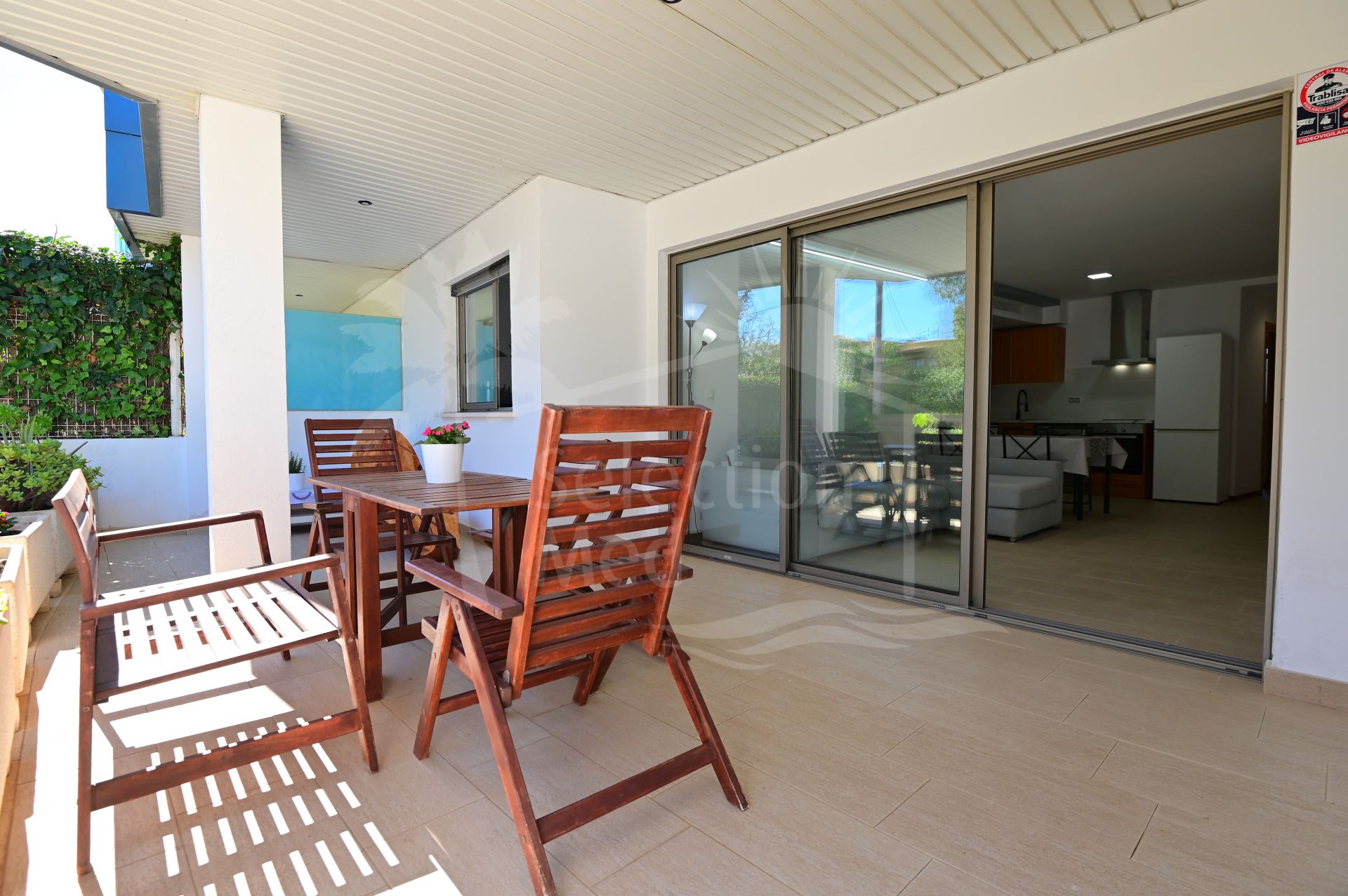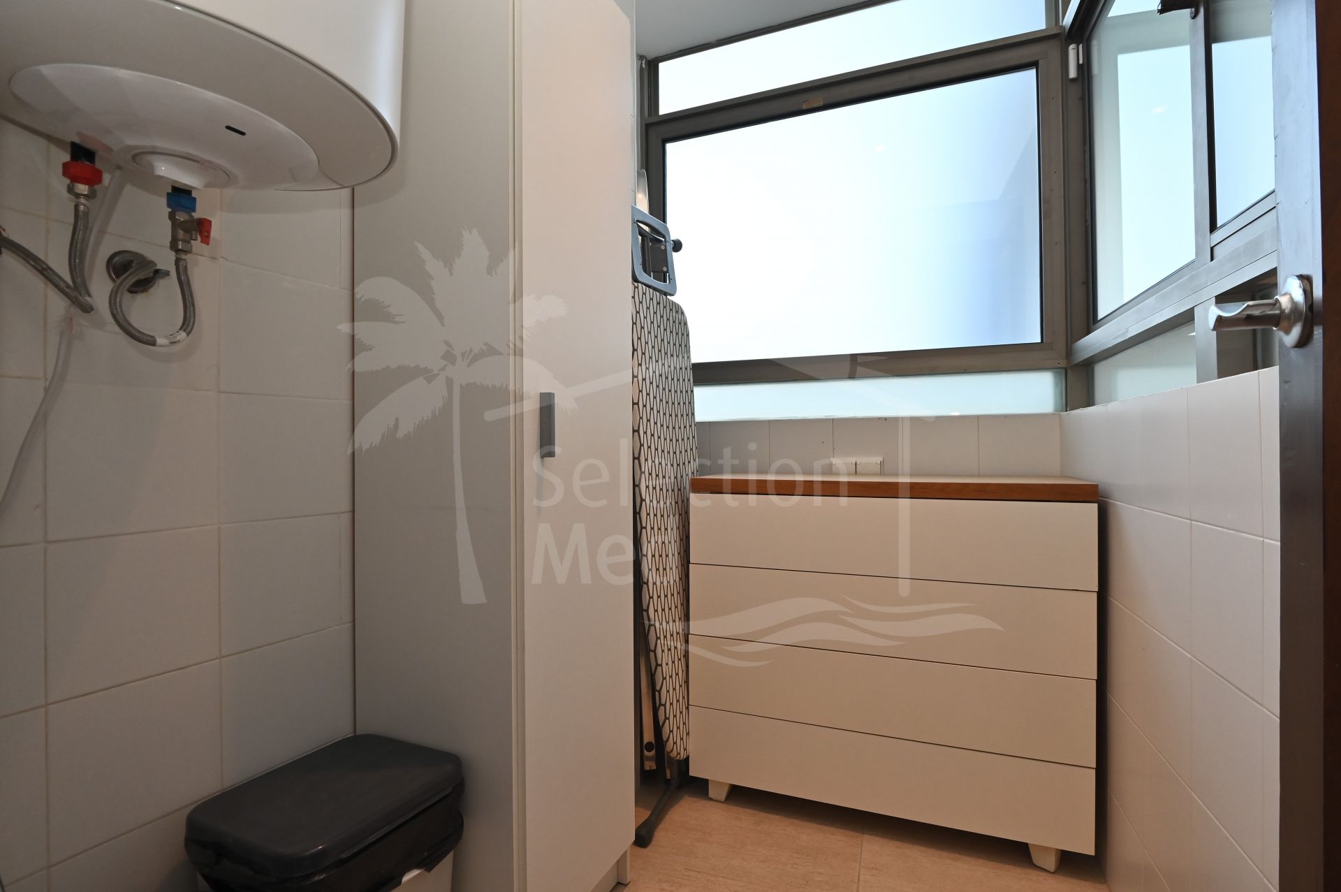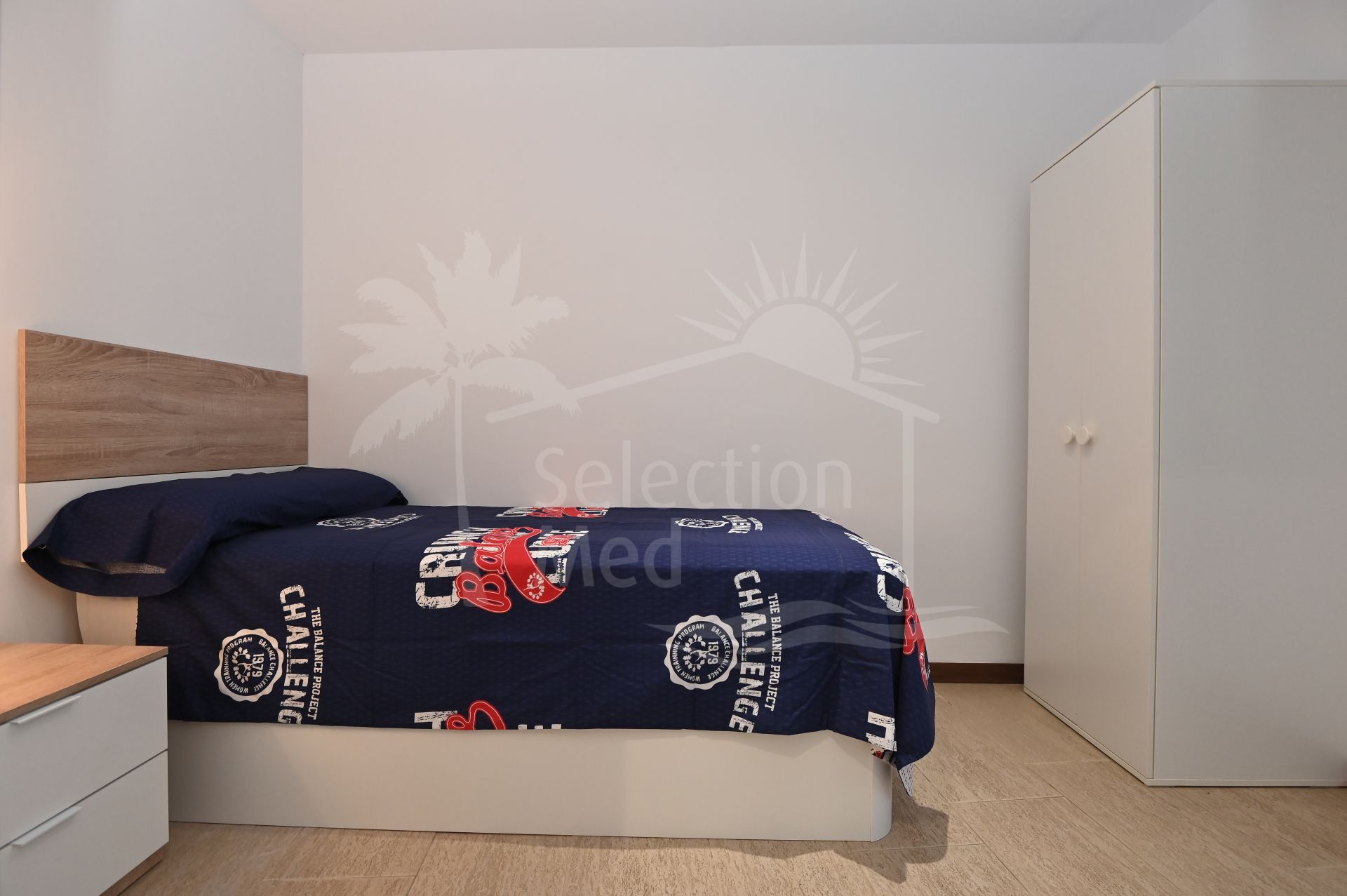 L’appartement, récemment rénové et en excellent état, est situé au rez-de-chaussée et se distingue par son design fonctionnel et moderne. Il dispose de deux chambres, une double et une simple, d’une salle de bain complète et d’une cuisine ouverte parfaitement intégrée à l’espace principal. Le logement offre une surface construite de 96 m², dont 79 m² habitables, complétés par une terrasse privée de 22 m² et un jardin de 38 m² avec accès indépendant, idéal pour profiter de la vie en plein air en toute intimité.