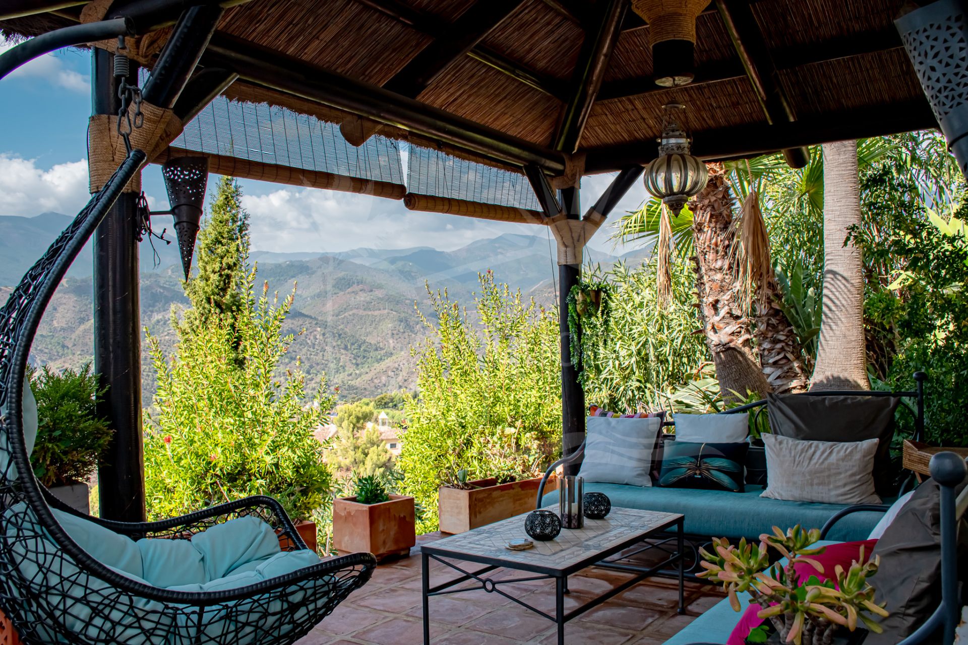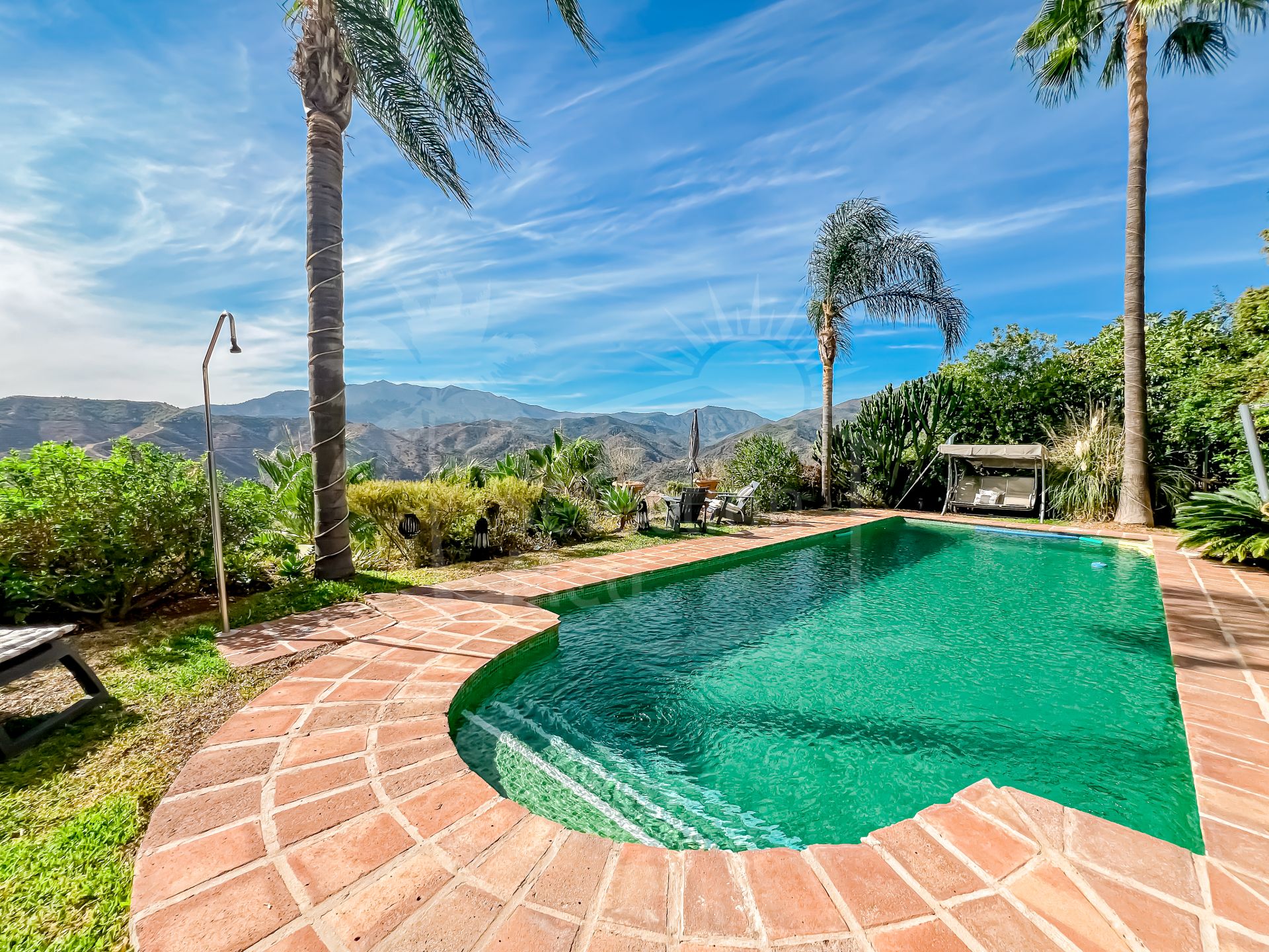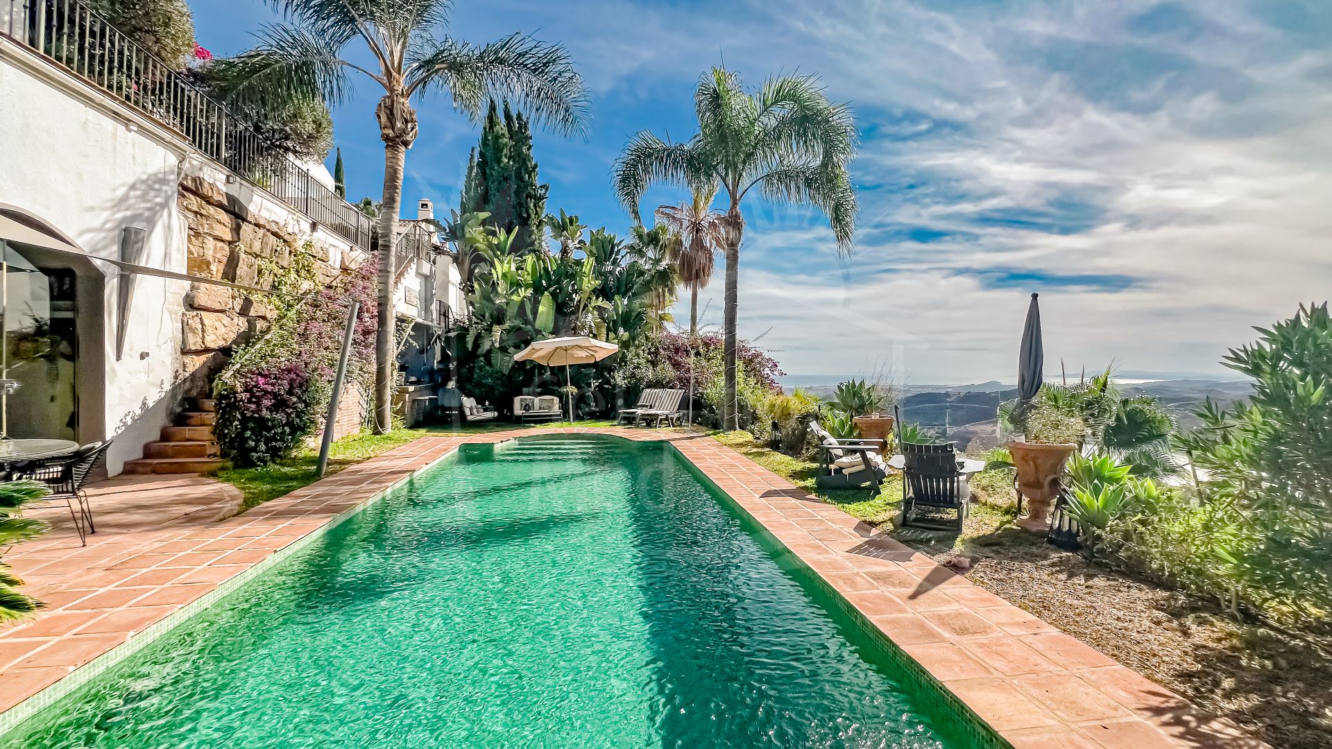 Cette propriété se distingue par ses nombreux espaces extérieurs permettant de profiter du soleil de la Costa del Sol toute l’année. Un espace pergola, perché au sommet de la maison, offre un refuge paisible en soirée avec vue sur les montagnes. La terrasse du patio offre un espace matinal tranquille pour apprécier le calme environnant. En contrebas, l’espace piscine est aménagé avec un bar entouré de nature et de pierres, un lieu élégant pour admirer le coucher du soleil, et un jardin planté d’arbres fruitiers. L’appartement d’invités est accessible directement depuis cet espace.