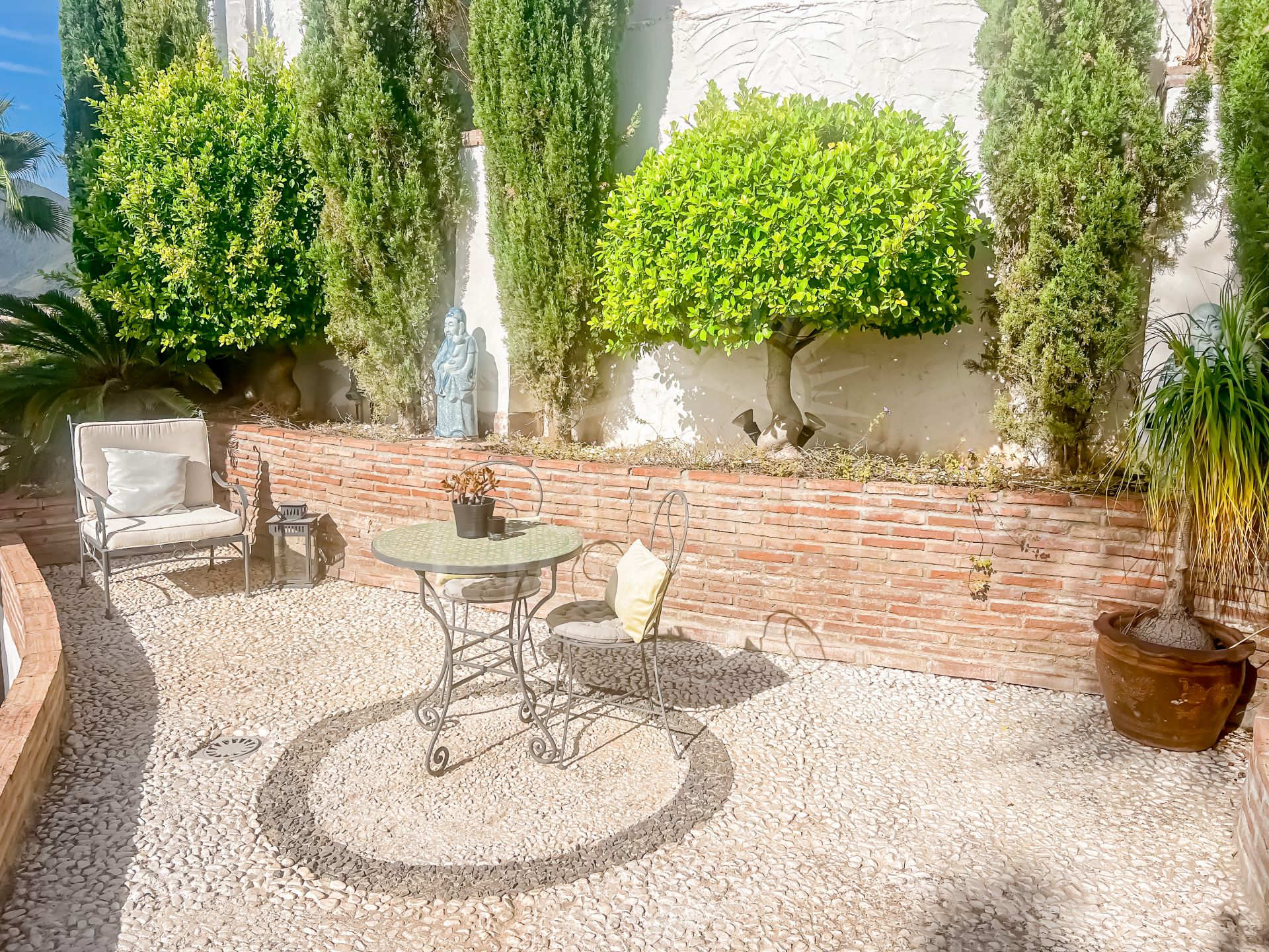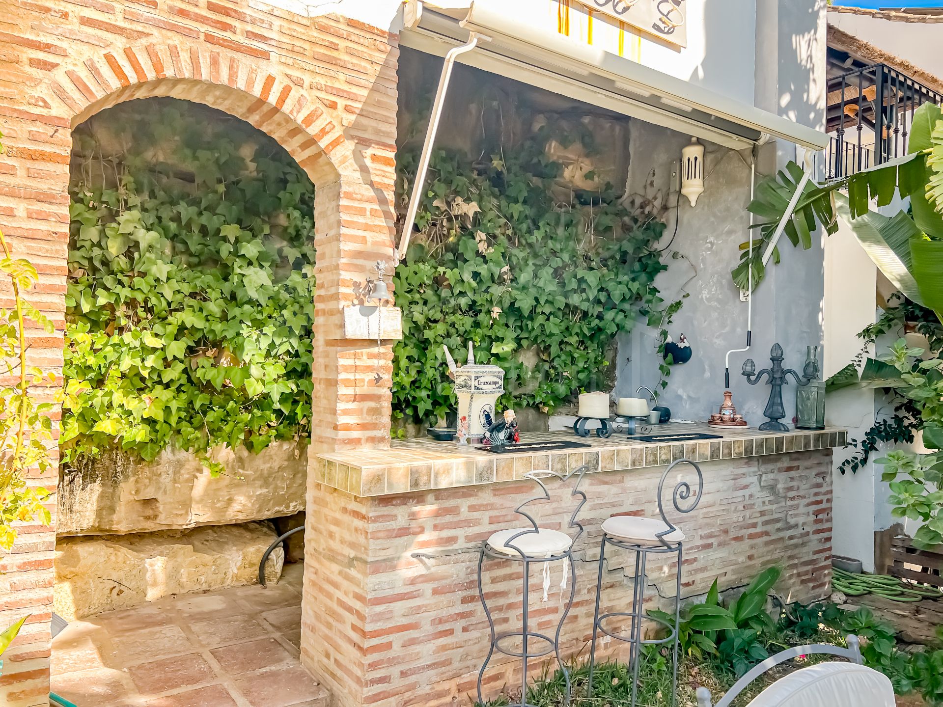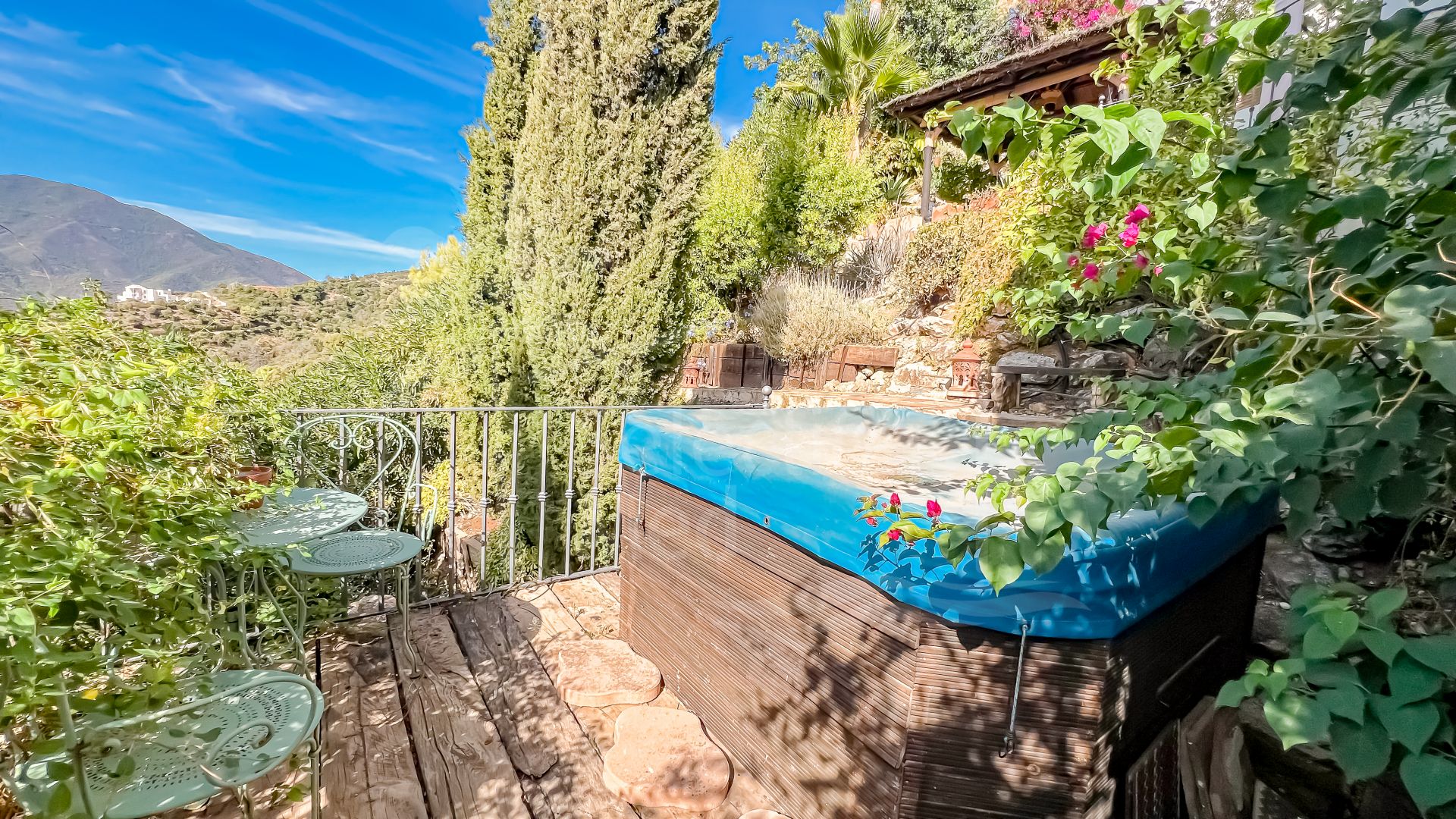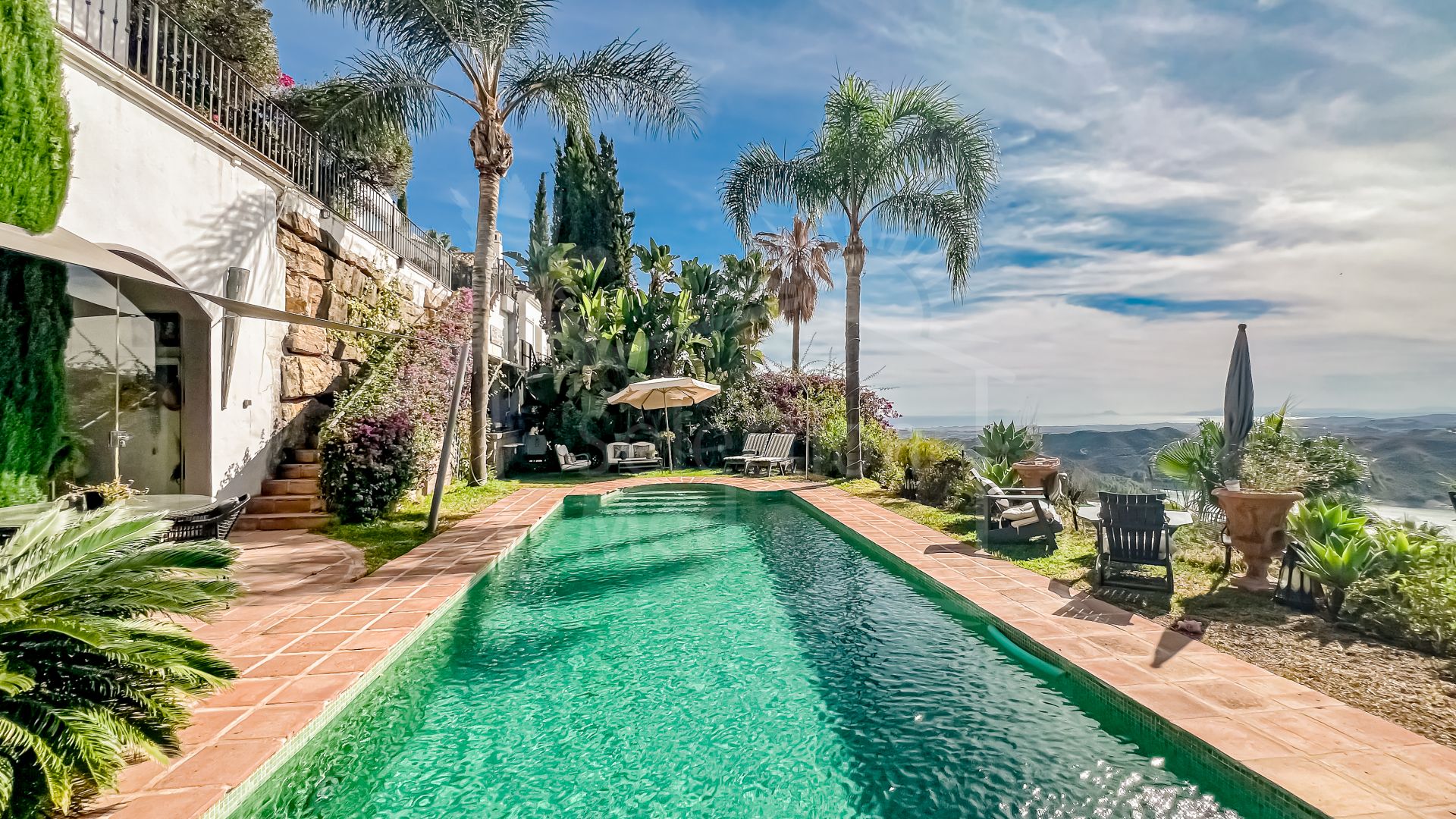 Cette propriété se distingue par ses nombreux espaces extérieurs permettant de profiter du soleil de la Costa del Sol toute l’année. Un espace pergola, perché au sommet de la maison, offre un refuge paisible en soirée avec vue sur les montagnes. La terrasse du patio offre un espace matinal tranquille pour apprécier le calme environnant. En contrebas, l’espace piscine est aménagé avec un bar entouré de nature et de pierres, un lieu élégant pour admirer le coucher du soleil, et un jardin planté d’arbres fruitiers. L’appartement d’invités est accessible directement depuis cet espace.