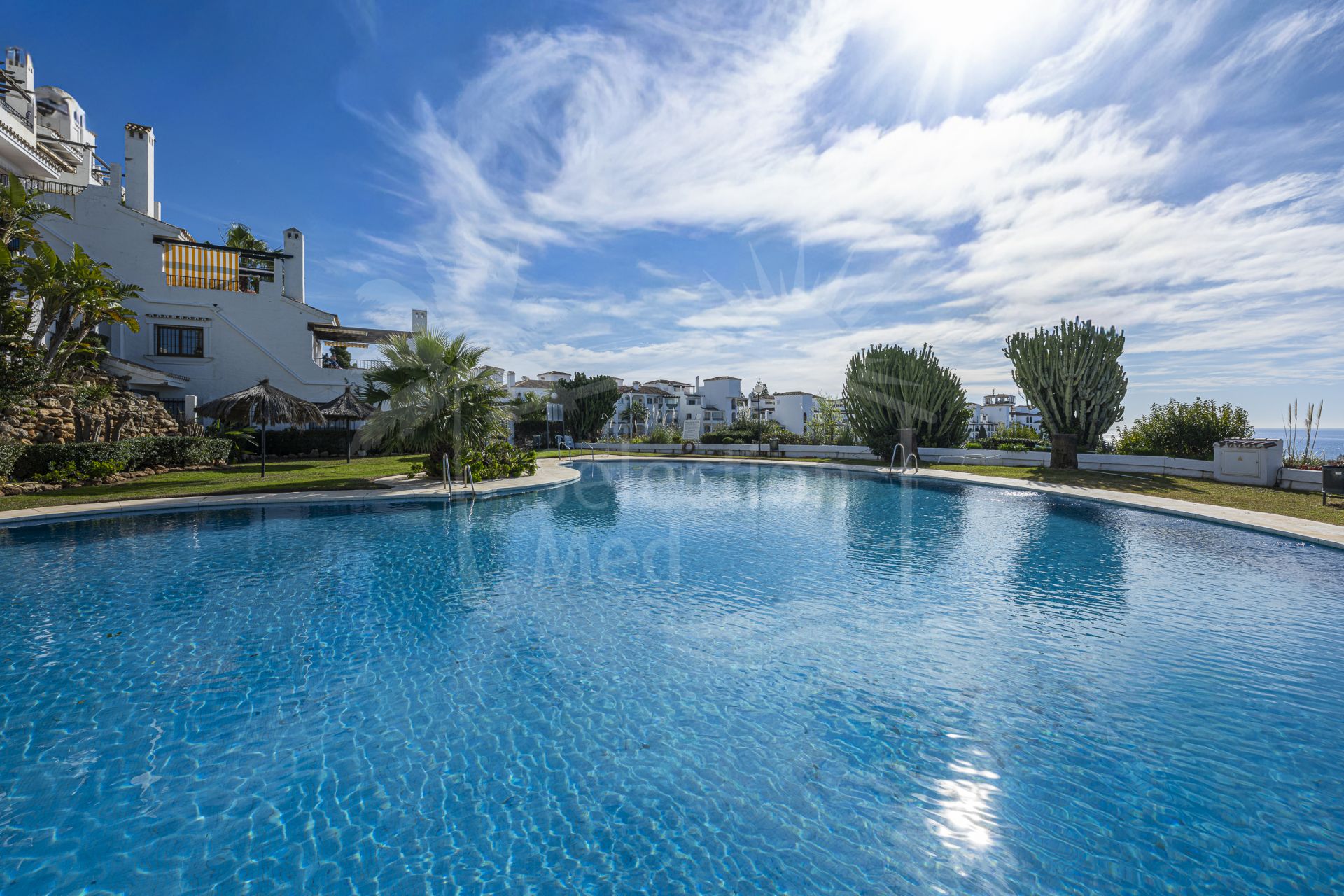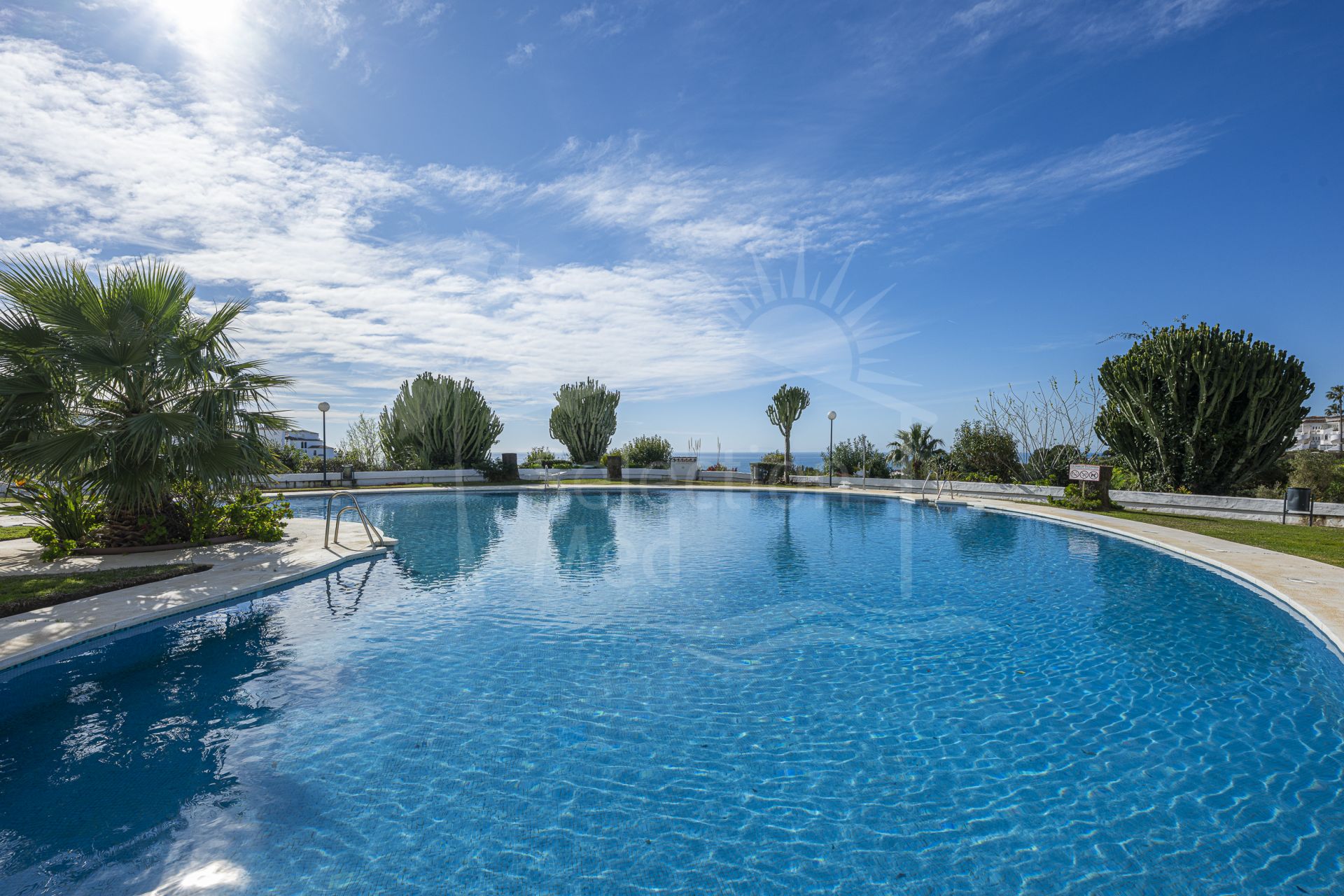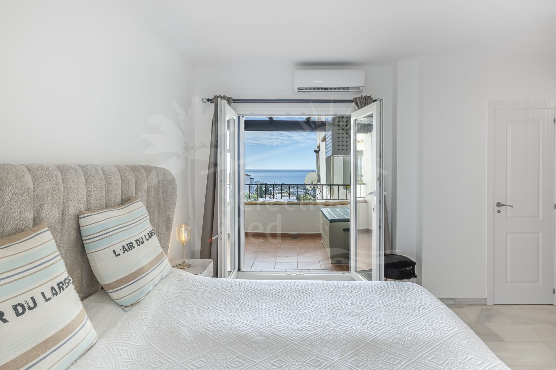 À l’intérieur, la propriété est lumineuse et bien agencée. Le salon et la salle à manger sont ouverts et baignés de lumière naturelle. De grandes portes mènent directement à la terrasse orientée au sud, intégrant la mer dans votre quotidien. Il y a une cheminée dans le salon, qui ajoute de la chaleur et du caractère pendant les mois plus frais. La cuisine est moderne et ouverte sur l’espace de vie principal, ce qui facilite la préparation des repas et la convivialité. L’appartement dispose de deux grandes chambres doubles et de deux salles de bains. La chambre principale comprend une salle de bains privative et sa propre terrasse avec vue imprenable sur la mer, un endroit paisible pour le café du matin ou pour les couchers de soleil. La seconde chambre est également de bonne taille et idéale pour les invités, la famille ou un bureau à domicile. La climatisation est installée pour un confort toute l’année. La communauté est bien entretenue et propose des jardins communs paysagers, une grande piscine extérieure et une piscine intérieure couverte et chauffée, permettant de nager en toute saison.