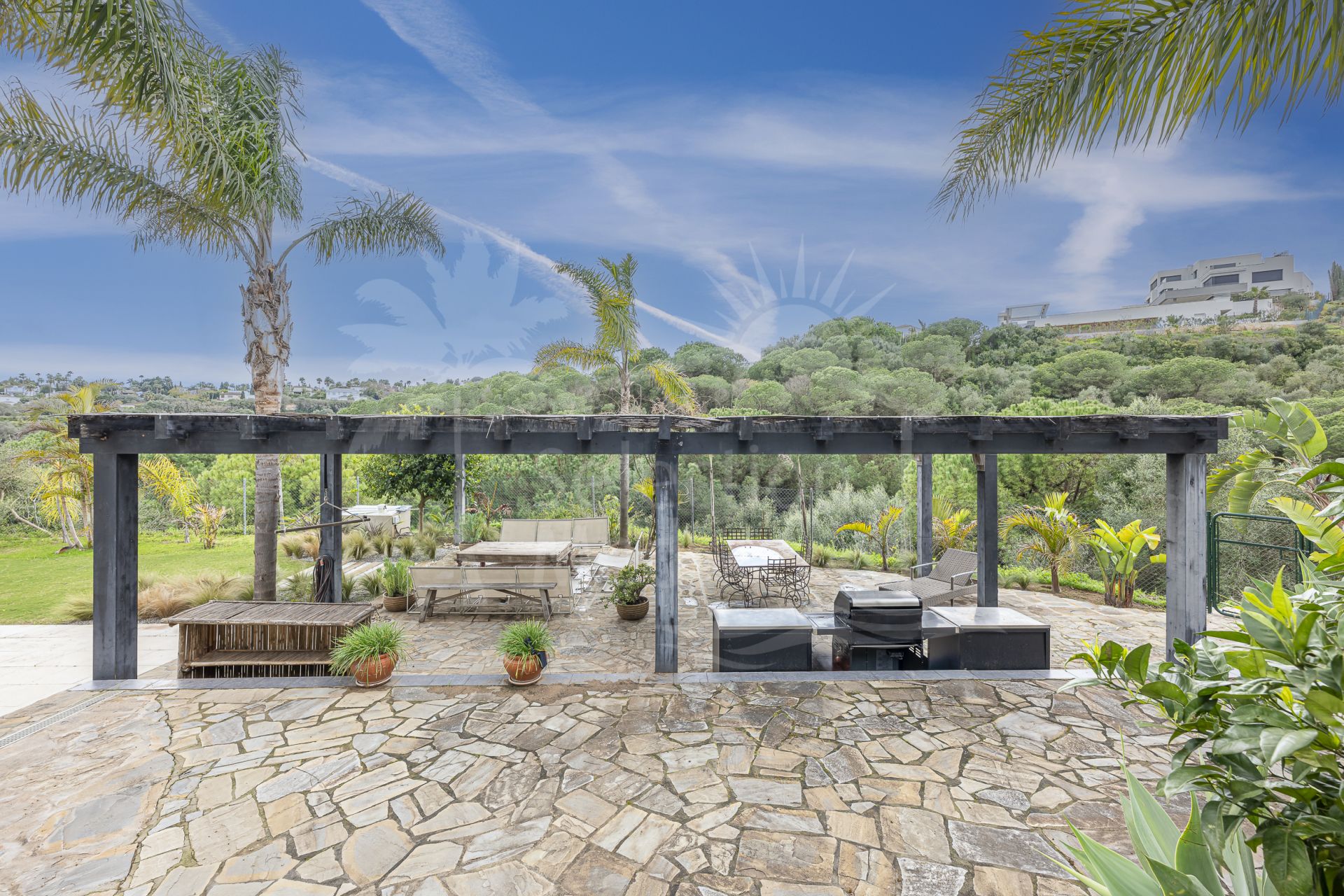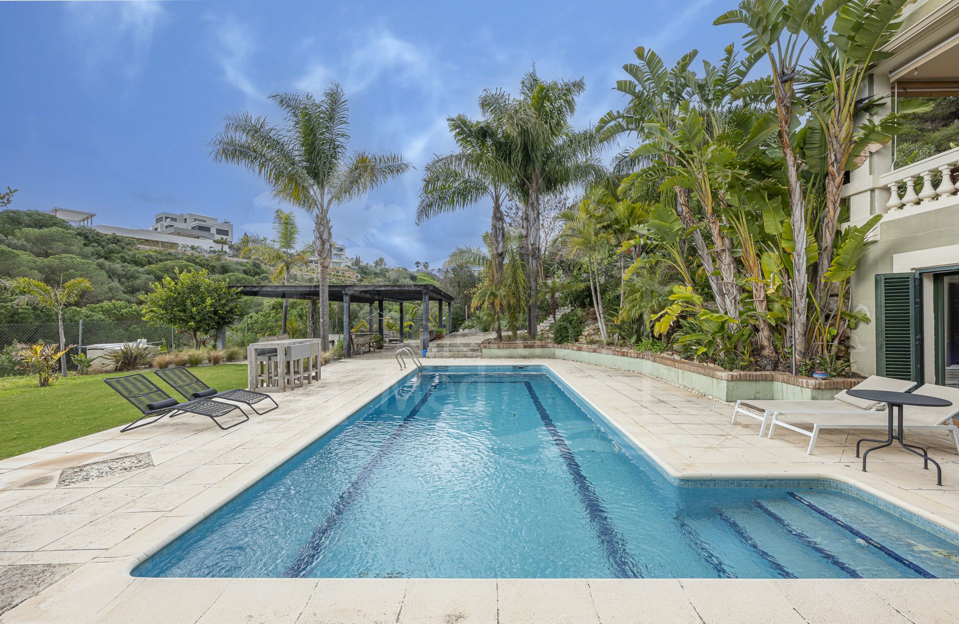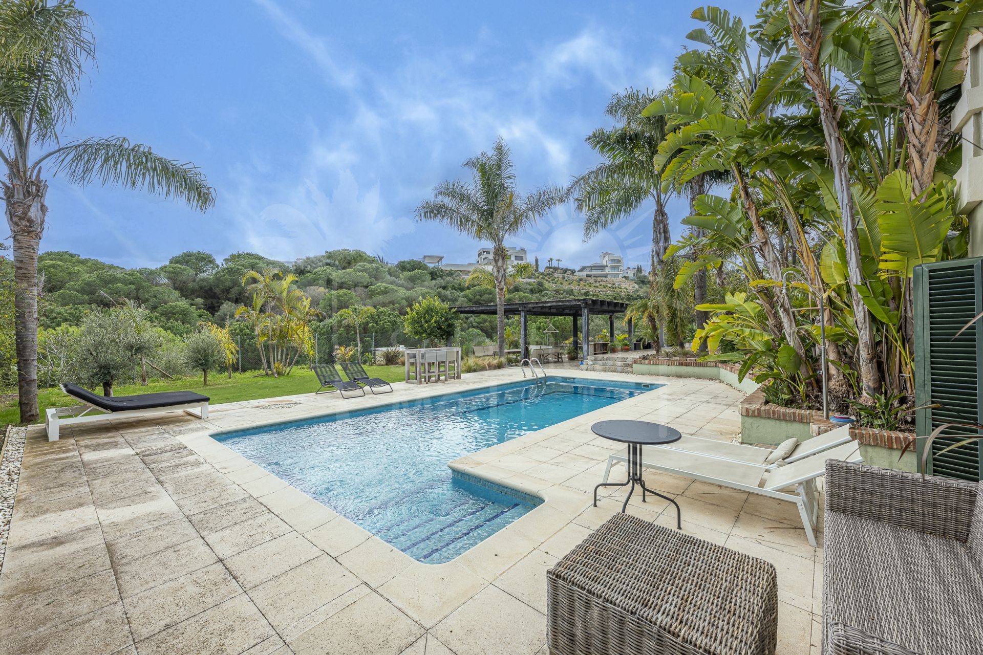 Maison à vendre à Sotogolf, Sotogrande Alto avec 4 chambres, 3 salles de bains, 1 toilettes, construit à 2003 et a piscine (privé), garage (abri voiture) et jardin (privé). Dimensions: 340m² construit, 950m² parcelle, 340m² intérieur et 33m² terrasse.