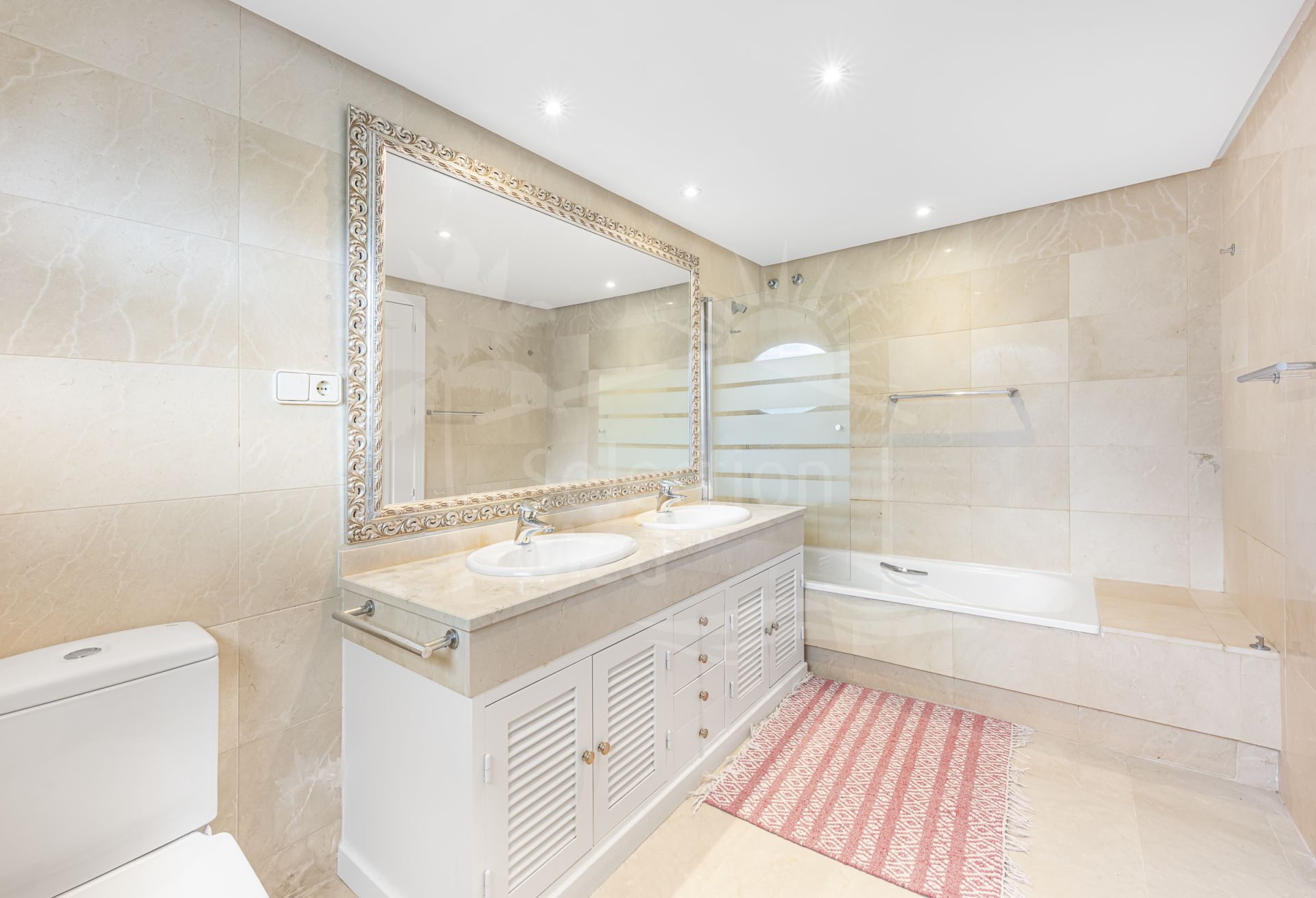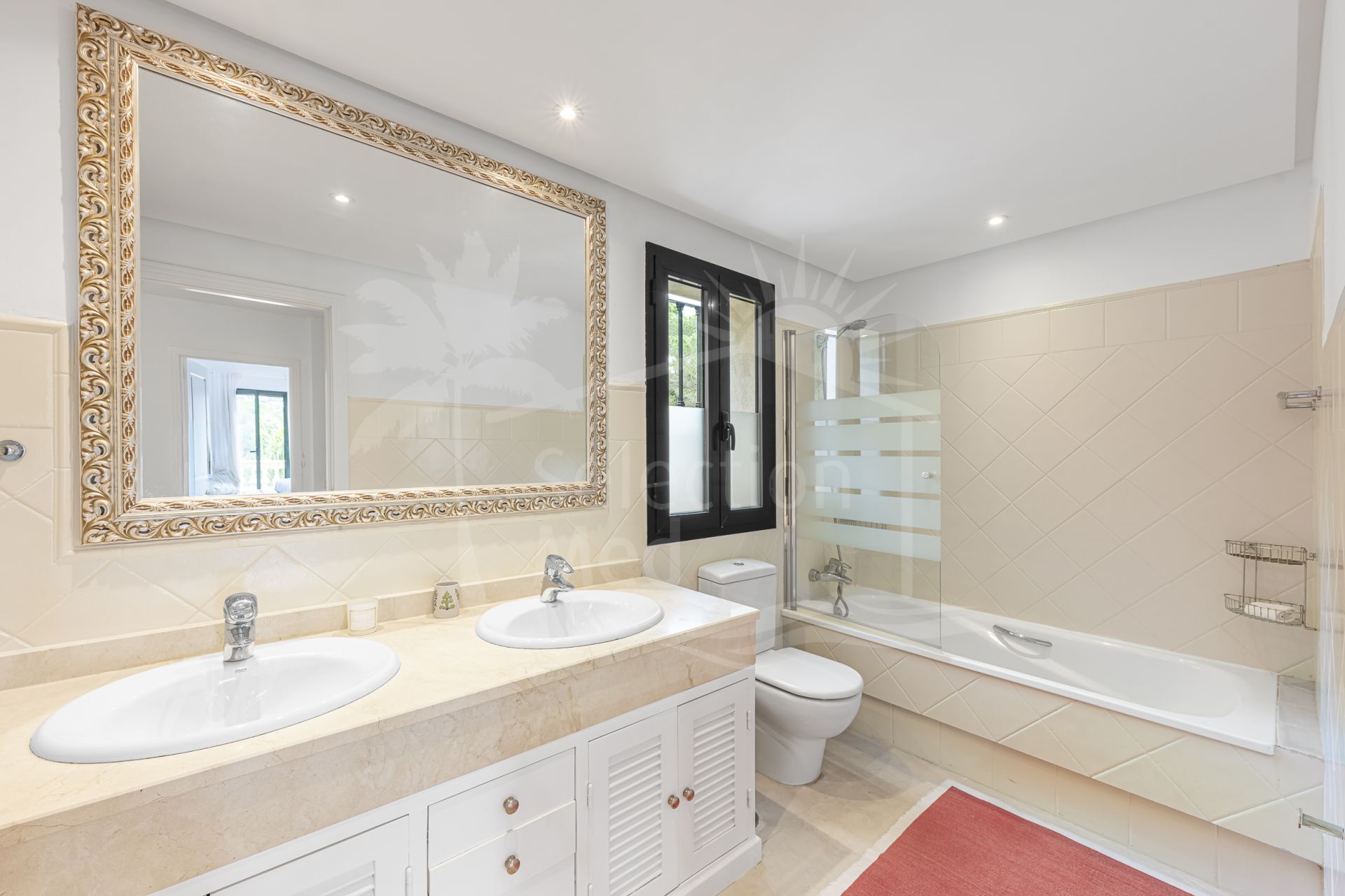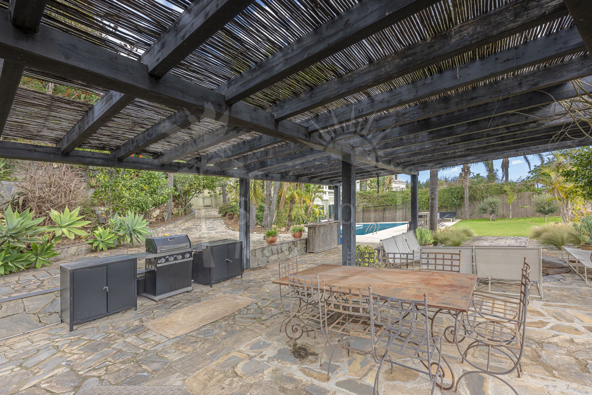 Maison à vendre à Sotogolf, Sotogrande Alto avec 4 chambres, 3 salles de bains, 1 toilettes, construit à 2003 et a piscine (privé), garage (abri voiture) et jardin (privé). Dimensions: 340m² construit, 950m² parcelle, 340m² intérieur et 33m² terrasse.