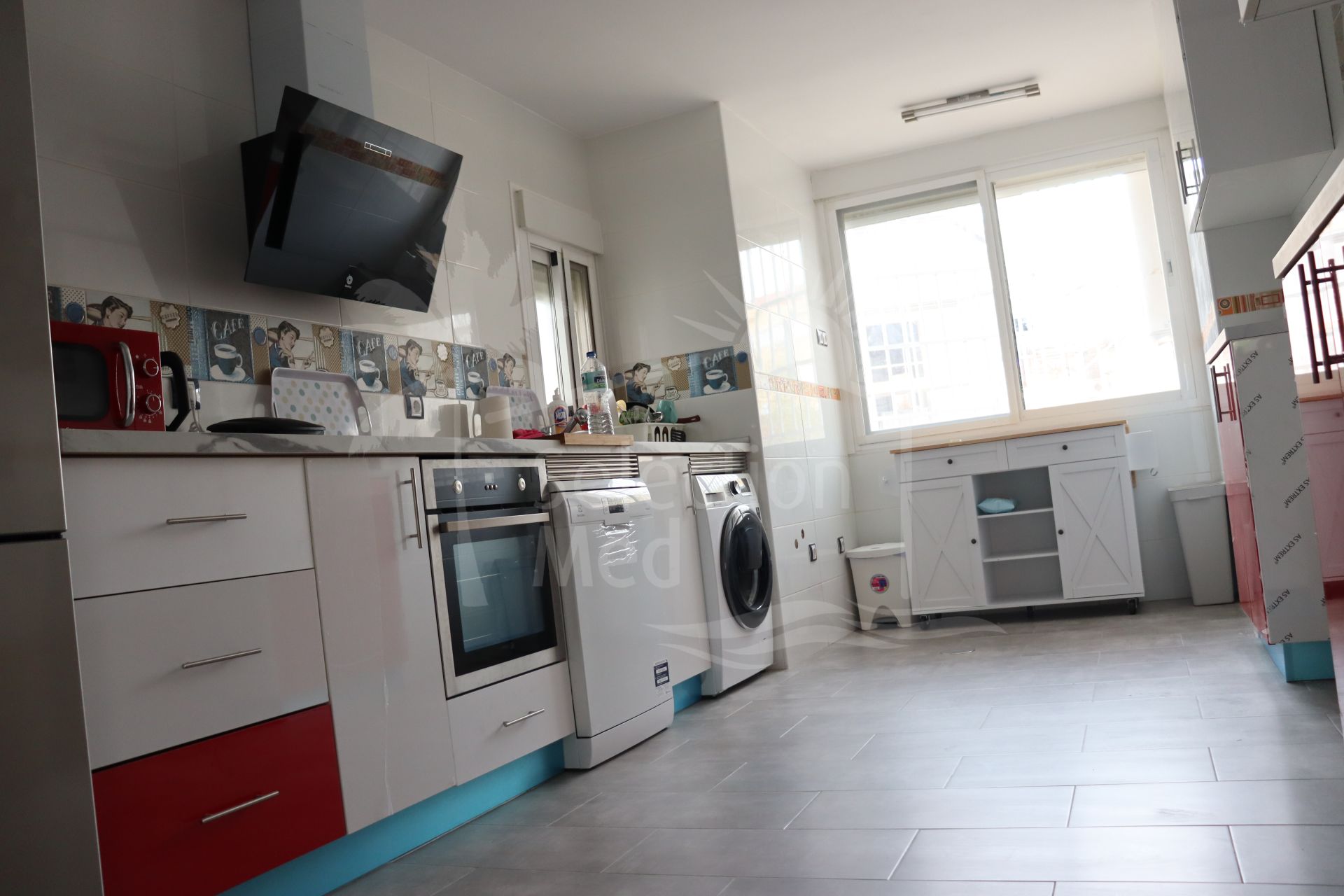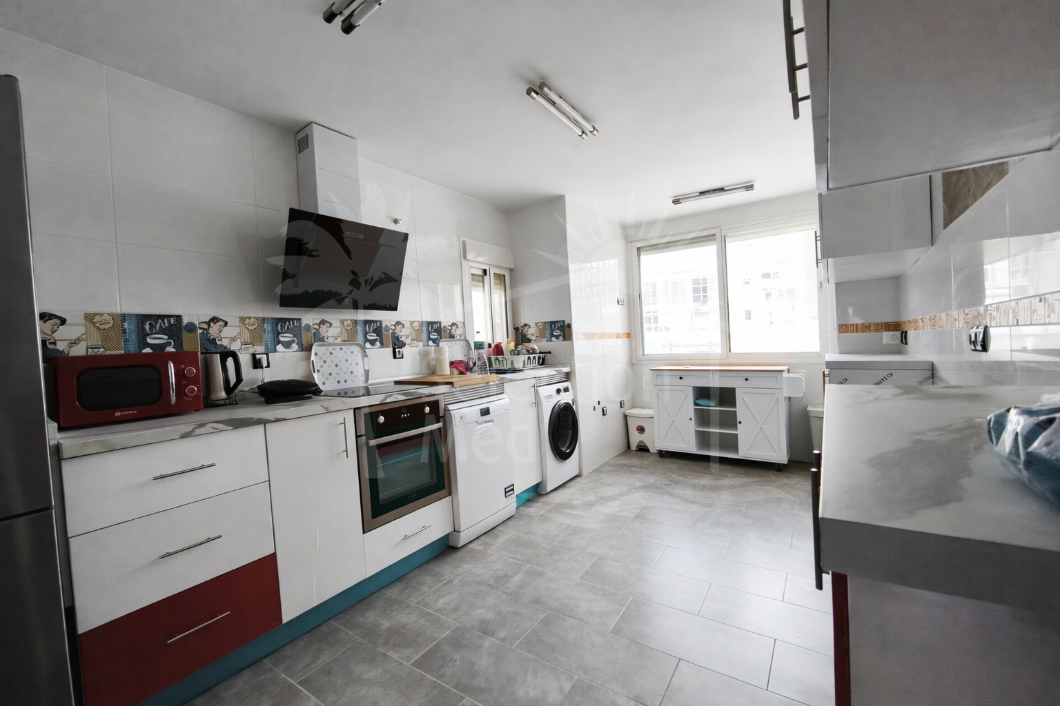 La cuisine, conçue dans un concept moderne ouvert, est entièrement équipée et pratiquement toute neuve, combinant fonctionnalité et style contemporain.