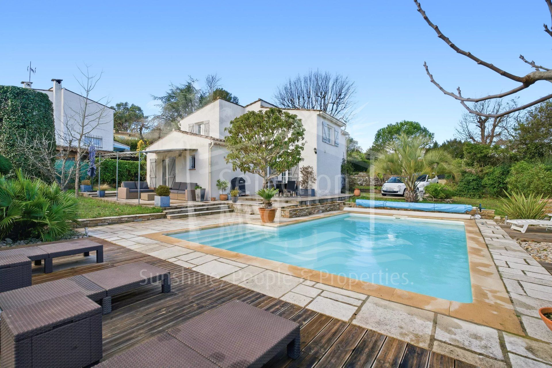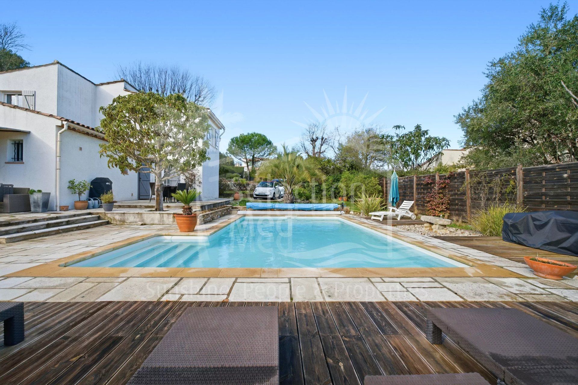 Maison à vendre à Valbonne avec 3 chambres, 2 salles de bains, 2 toilets, construit à 1972 et a piscine et garage. Dimensions: 992m² parcelle et 107m² intérieur.