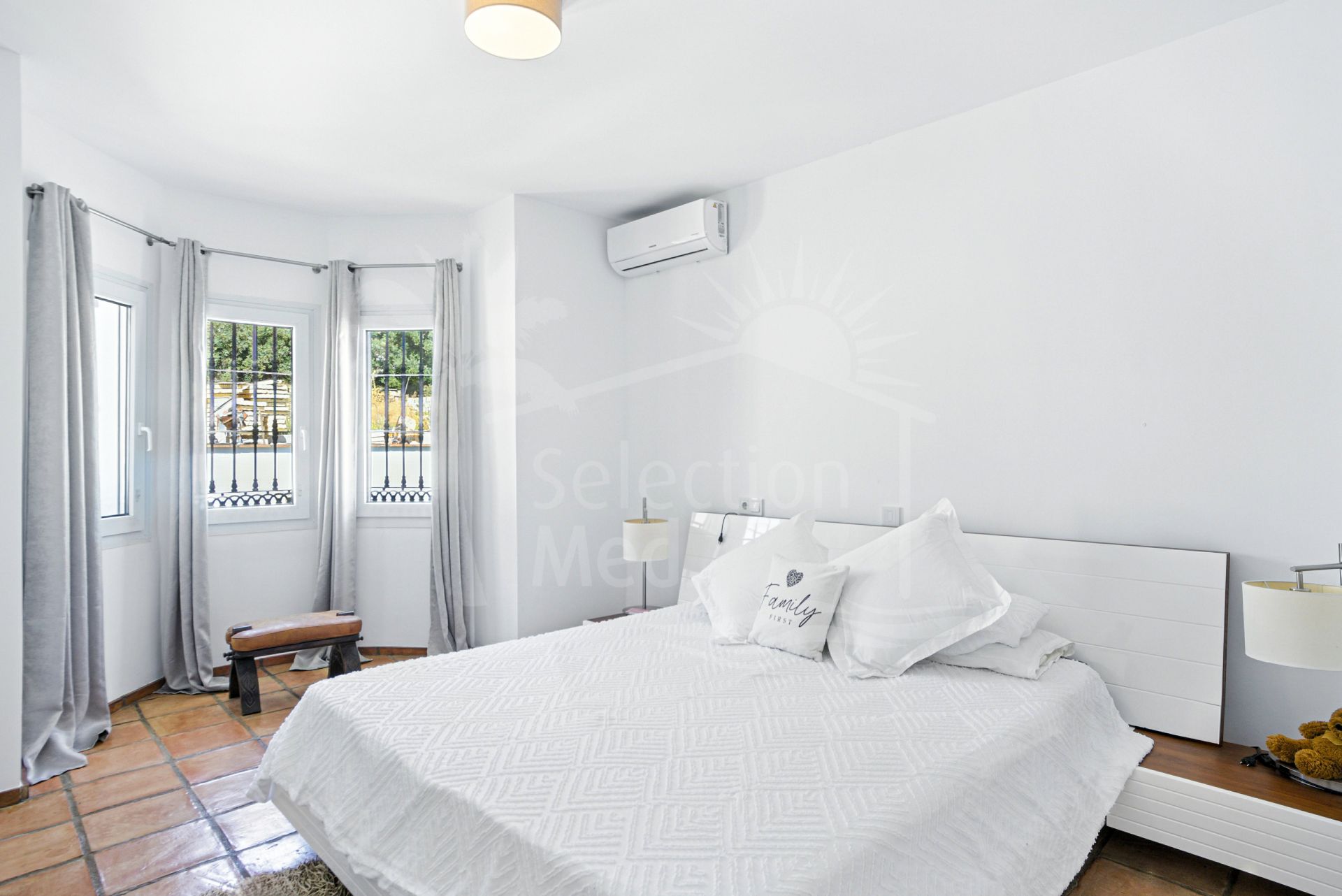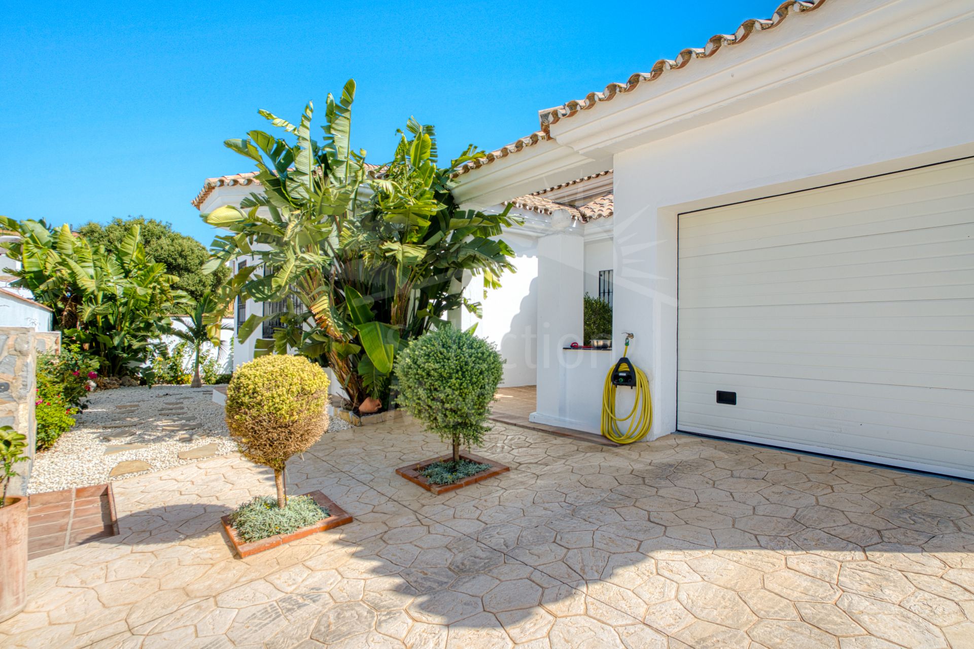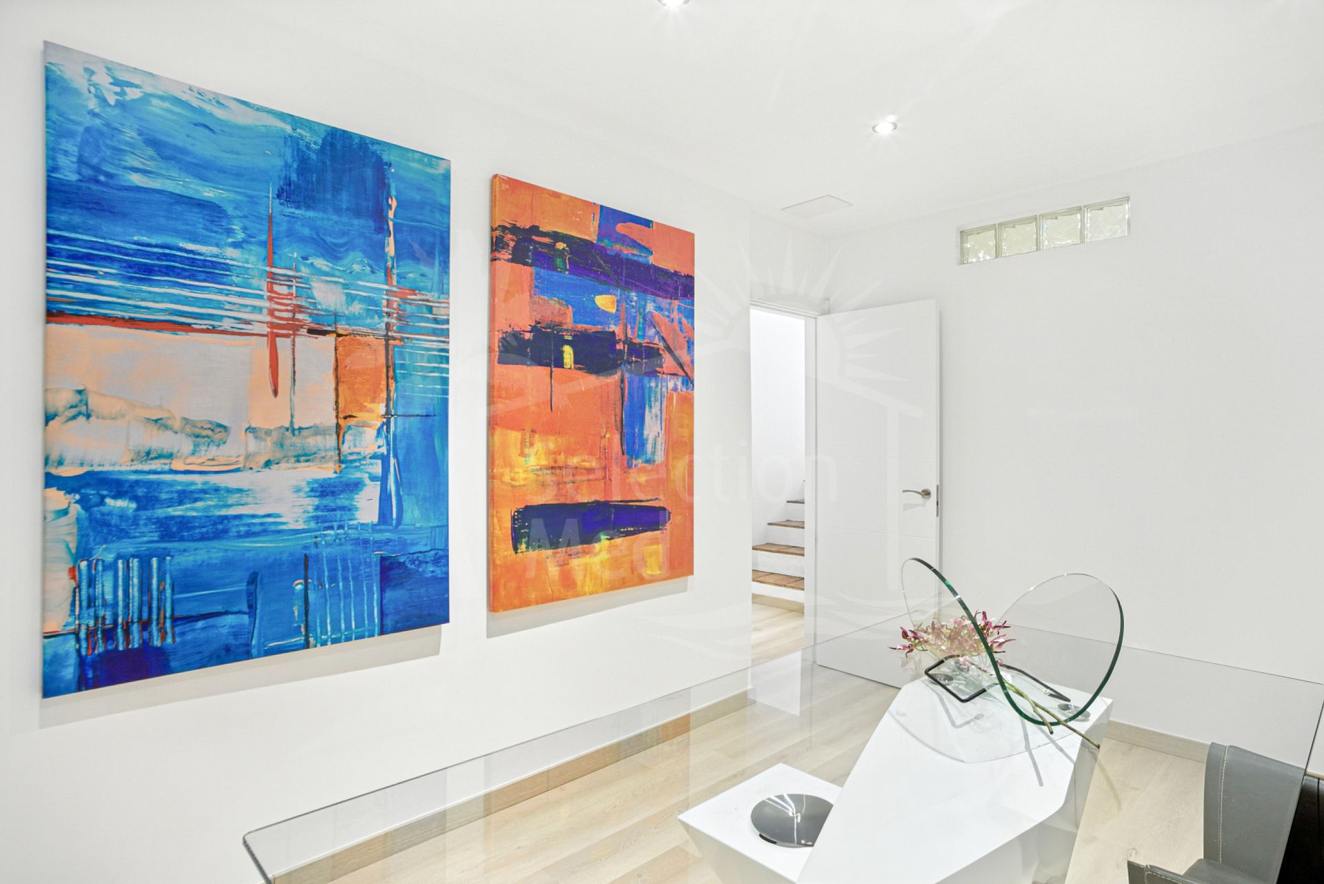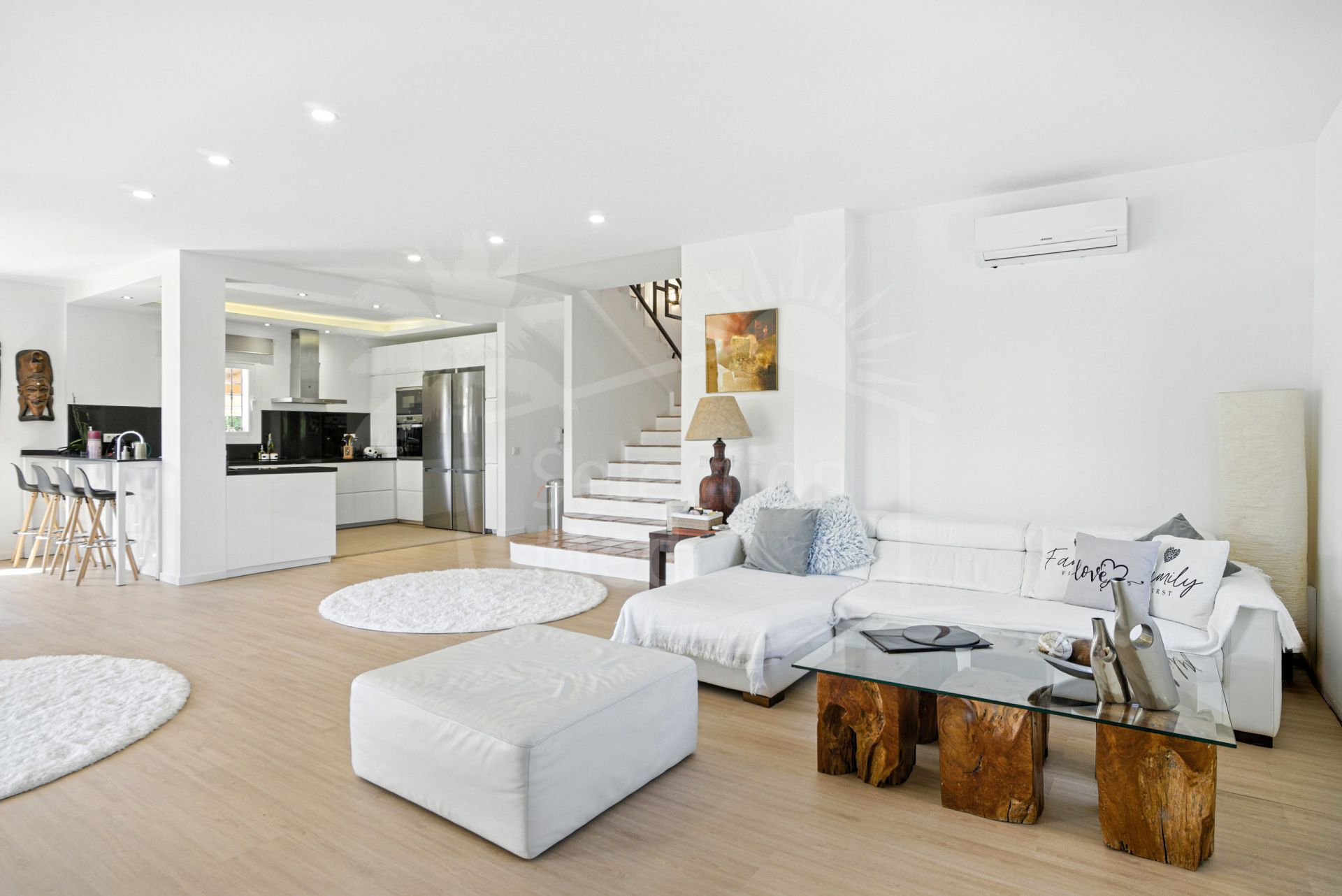 Fantastique villa avec vue sur le golf dans la zone prestigieuse de Valle Romano (Estepona), situé près de la plage, des supermarchés, des restaurants et des bars de plage. Cette propriété bénéficie d'une orientation sud-ouest et offre une combinaison parfaite de confort, d'intimité et d'un excellent emplacement dans un quartier calme et bien relié. La maison est répartie sur trois étages, à l'étage principal, il y a un salon spacieux avec accès direct à la terrasse, le jardin et la piscine privée, une cuisine entièrement équipée, deux chambres et une salle de bains complète. L'étage supérieur dispose de la chambre principale avec salle de bains privative et accès à une grande terrasse avec vue fantastique. L'étage inférieur comprend deux chambres supplémentaires et une salle de bains. Une des chambres est actuellement utilisée comme un bureau, et ce niveau offre la possibilité d'être transformé en un appartement indépendant. Les autres caractéristiques comprennent les placards, la salle de rangement, le garage privé, le système d'alarme, les caméras de sécurité et les panneaux solaires.